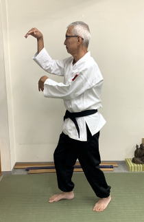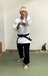護身道には、鍵手構えがあります。構えは、手首を内側に折り曲げて作る。
