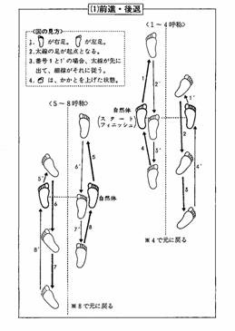 前後左右、転換、回転など身体を自由自在に動かせることは、暴漢から身をよけたり、護身道の技の習得に大事なことです。実際には、種々多彩な動きがありますが、その基本となる次の8つの動きを「米字八法」として体操化、体さばき習得の便に供しています。
