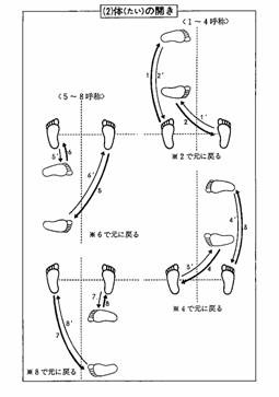 鍵手構えを保持しながら、前進、後退、90度転換、180度転回など自由自在に動き回れるように構成されています。